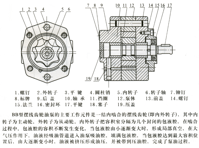 BB-型擺線齒輪泵是一種容積內(nèi)嚙合齒輪油泵,其內(nèi)齒輪(即外轉(zhuǎn)子)為圓弧齒形,外齒輪(即內(nèi)轉(zhuǎn)子)為短幅外擺線的齒輪泵。